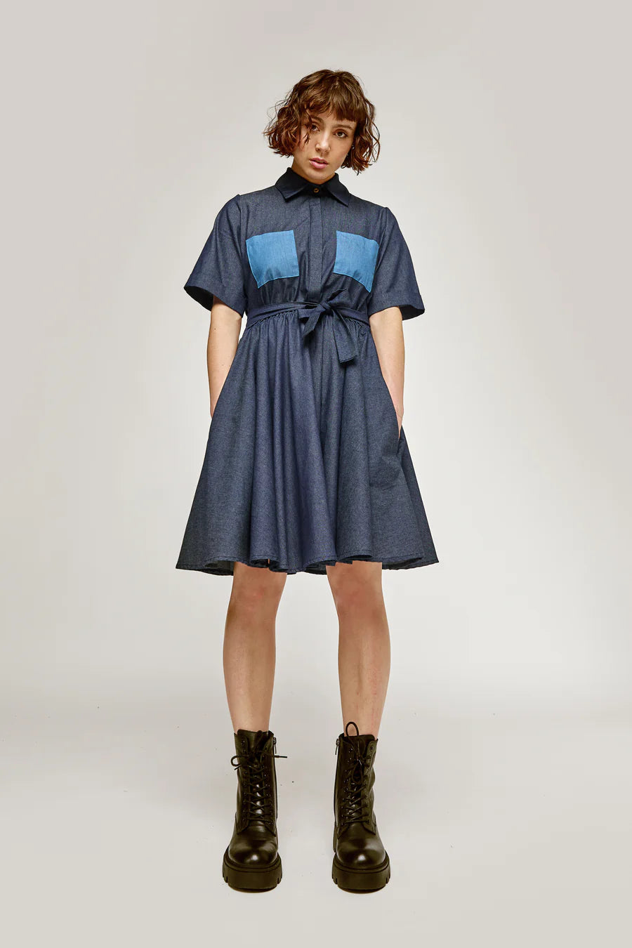 This dress perfectly combines comfort and style. Its belt accentuates the waist, while the contrasting patch pockets add a fun touch. Perfect for a cool look, it can also be worn with running shoes for a casual and dynamic look.