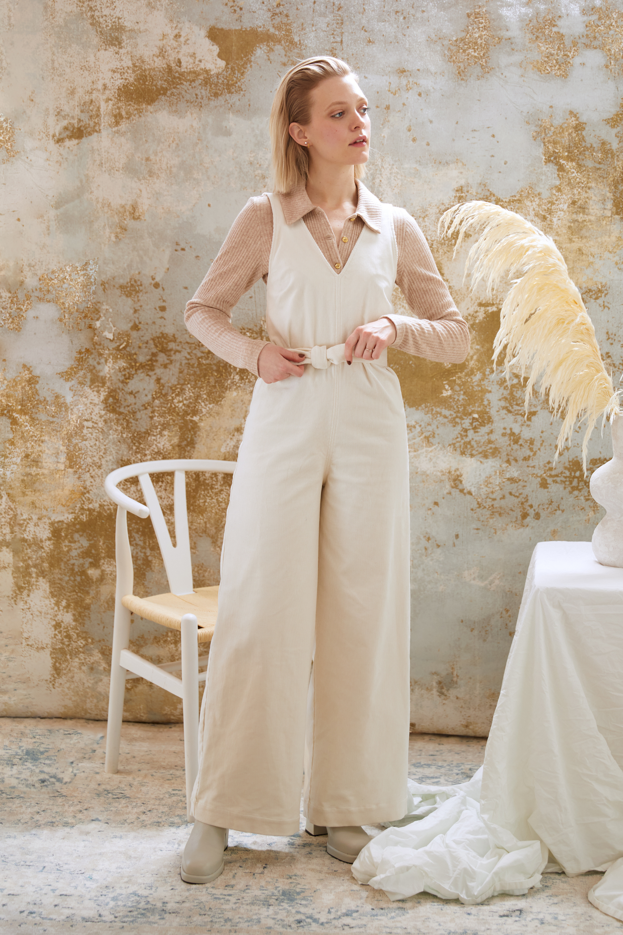 Clara est une combinaison dotée d'un décolleté en V flatteur. La ceinture ajustable met en valeur la taille tout en ajoutant une touche d'élégance à sa coupe oversize. Ses jambes larges lui confèrent un style rétro intemporel. Cette tenue polyvalente peut être portée au travail ou en vacances, alliant le confort décontracté à l'élégance.